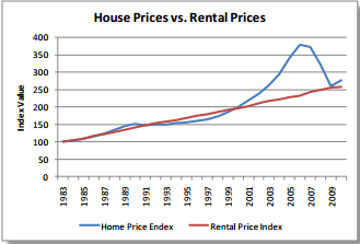 By now we all know we were in the midst of a housing bubble earlier this decade, which peaked in 2006-2007 in most areas. While it’s easy to say in hindsight, one of the clearest depictions of just how dislocated prices were compared to the fundamental value of a home is a comparison of housing prices to rental prices. A house’s value can always be tied back to the cash flows that an owner of that house could earn if she rented the house to a tenant. In other words, a good way of determining if a house is too expensive compared to renting is to determine if you can cover the costs of ownership (mortgage interest, insurance, property taxes, association fees if applicable, maintenance, potential vacancy, management, etc.) with the rental income. If you’re planning to buy a rental property, contact your advisor who can help you project the long-term return on your investment taking all of these factors into account.