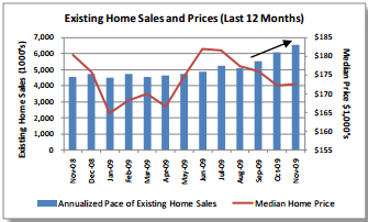 Additionally, there have been strong signs of life in the housing market in recent months with existing home sales gaining ground in four consecutive months (Aug-Nov). Not only have sales been increasing month over month, November’s sales are up 44% over November of 2008, showing the people are definitely out there buying. The number of homes for sale has also come down in the past four months, from just over 4 million, to just over 3.5 million. If the pace of sales from November could continue and no additional houses were put on the market, the current inventory of homes for sale would be depleted in 6.5 months. That compares to about 4-5 months of supply in a steady housing market, and a peak of 10-11 months around this time last year during the worst of the downturn.