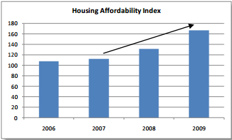 a housing affordability index based on median income vs. the principal and interest owed monthly on the average mortgage for a home with the median home price. This index has soared as prices and rates have come down, but incomes have remained fairly steady in the past few years. The Fed has indicated that it plans to end its mortgage purchase program in March 2010 which could allow rates to start increasing. Combined with the credit ending in April 2010, this could put pressure on the housing market for a second wave down in prices.