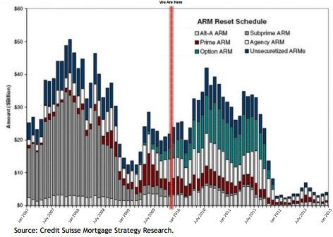 Also potentially impacting prices going forward is the rate of foreclosures. Again, a bit of improvement in recent months as new foreclosure filings have decreased. This is in part due to the moratorium on foreclosures in some states as well as the ramp down in subprime, adjustable rate mortgage (ARM) resets. But, while we’re almost out of the woods on subprime, there is a new wave of ARM resets coming, in the form of option-ARMs. These are adjustable rate mortgages that allow the borrower to choose his monthly payment, sometimes even less than the interest amount, which can result in increasing rather than decreasing mortgage balances. As those rates reset from extremely low teaser rates, more homeowners could find themselves unable to make their payments, just like the subprime situation that peaked in 2008.
