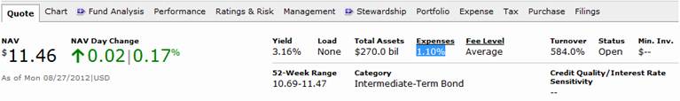 Investment fees are those charged by the investment funds themselves as a ways of generating a profit on their funds as well as offsetting the cost to create, maintain, and distribute the funds. These fees are passed onto investors in the fund (whether it’s through a retirement plan or an individual investment) through the fund’s expense ratio. You can find the fund’s expense ratio in the Fact Sheet or Prospectus for the fund. If the fund is publicly traded with a 5-letter ticker symbol, you can also look it up at Morningstar.com (snip from Morningstar for a particular mutual fund is shown below with the expense ratio highlighted).