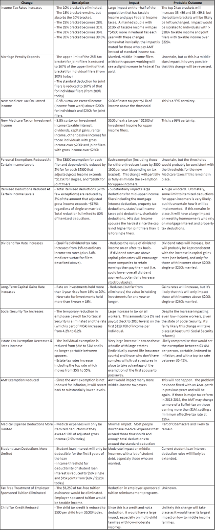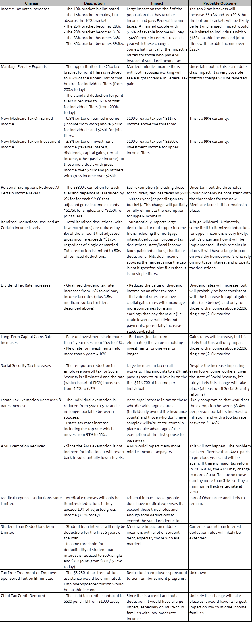 By now everyone has heard of the tax increases and spending cuts that will take effect in 2013 under current law, not-so-affectionately-called “The Fiscal Cliff”. This post takes a look at many of the tax changes which will have a broad impact on individuals and joint filers regardless of income. While the list is not all-inclusive, it covers most of the changes that would affect individuals and couples (leaving out some of the business tax impacts). Some of these may come as a surprise since they don’t get much attention in the press. The chart below shows the changes as they are currently on the books, the impact of each change if left as is, and the probable outcome of efforts to avoid the Fiscal Cliff.