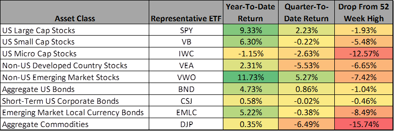 While the Dow and S&P 500 have done fairly well this year and have held up decently so far this quarter, other asset classes that aren’t in the headlines, but are part of a well-diversified portfolio, have fared far worse. Some classes, like Commodities and Microcap Stocks have even fallen enough to be considered in a “correction” by its classical definition (10% down from highs). The table below shows (through 9/22) year-to-date and quarter-to-date returns for a select group of ETFs that represent major asset classes, along with their decline from their high over the last 52 weeks.