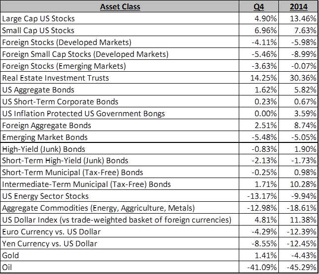 New highs in US Large Cap stocks did not follow through to many other asset classes in Q4 2014, largely because of currency shifts (US Dollar gains vs. virtually all other currencies which make foreign currency denominated investments worth less on a relative basis), lagging economic performance in Europe, and a sharp decline in energy prices (oil down over 40% in Q4 alone). The list bellow shows performance for a select set of asset classes using representative ETFs (or spot price in the case of a commodity) as a measure for each: