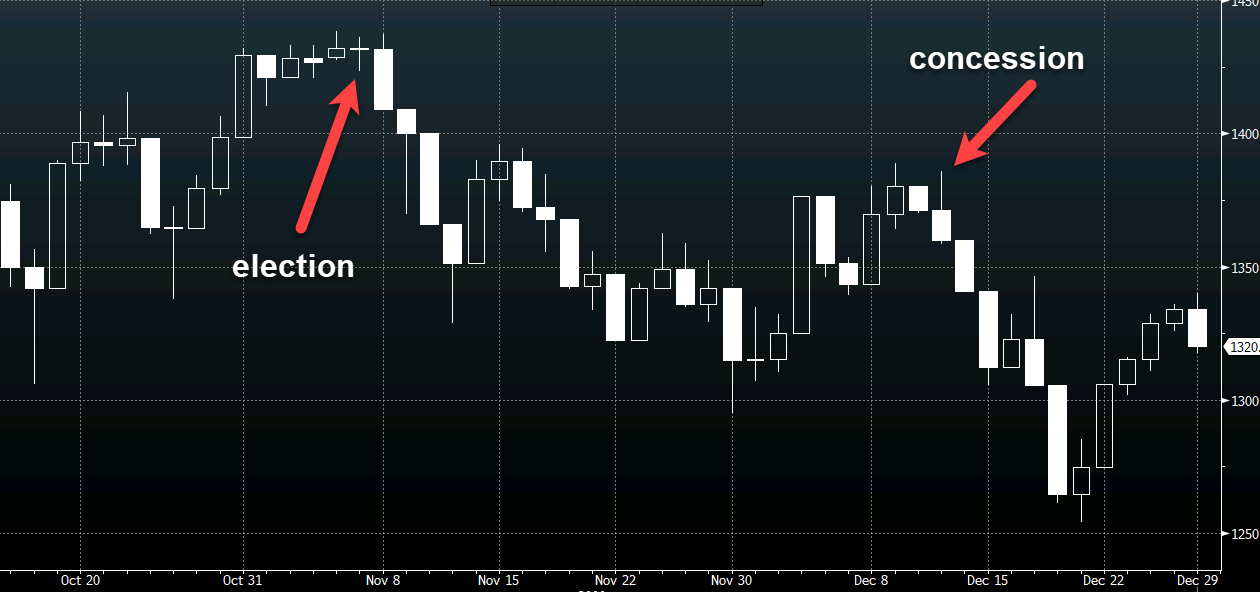 A: We know the stock market didn’t like the 2000 election result process (the FL “hanging chad” election), but it wasn’t exactly catastrophic, as the chart of the S&P 500 shows. It also wasn’t long-lasting.