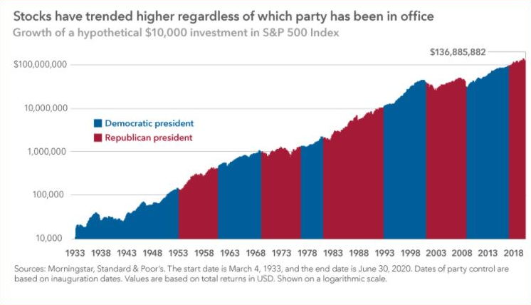 Sure, there are some dips in that chart, but for the most part it’s a steady upsloping line for 87 years regardless of party. By the way, I don’t think one can make any conclusions about which party is better for the market from that chart because the market prices in election results prior to the election and certainly prices in likely policy changes between election and inauguration. The takeaway should be that from a purely stock market perspective, if you zoom out far enough, it doesn’t really matter who wins a single presidential election.