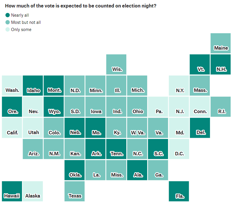 A: Each state has their own method of counting ballots. The NY Times recently attempted to summarize those methods. The battleground states have some significant differences. Florida, for example, has already counted many ballots received by mail and will release those counts along with in-person early voting by 8:30pm eastern. Election Day ballots will be counted through the night, but no additional mail-in ballots are allowed after 11/3. So we’ll know who won FL by 11/4 morning barring a 2000-like “hanging-chad” incident. Ohio also plans to release pre-election day votes 11/3 evening (by 8pm) and will count election day votes through the night. But, in stark contrast to FL, they will allow ballots postmarked by 11/3 and received by 11/13 to count, and then won’t provide updated results as those ballots come in. As of 11/2, officials say that full statewide results may not be known until the election is certified by the state on 11/28. Since the state knows how many mail-in ballots were sent out, it will know the maximum that could be received, but if neither candidate leads by enough to make it statistically impossible for the mail-in ballots to swing the results, it sounds like Ohio can’t be called until 11/28! 538 recently published a graphic with their opinion of the state-by-state portion of the vote that should be counted on election night: