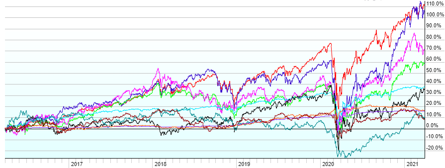 - It was a tough quarter for Bonds as interest rates rose, especially on longer-dated treasuries. The Federal Reserve indicated that they are likely to hold overnight rates at 0% through at least 2022, but longer term treasuries reacted to the increased likelihood of inflation with the US 10-yr Treasury rising to 1.74%, up from 0.93%, just a quarter ago. High-yield (“junk”) Bonds eked out a positive return (+0.6%), with US Short-Term Corporates losing 0.6%, and US Aggregate Bonds losing 3.6%. Local Currency Emerging Market Bonds fared worst at -7.1%.