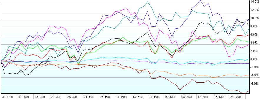 - Another great quarter for equities in Q1, following the spectacular Q4. US Small Caps led the way (+10.3%), followed by REITs (+8.8%), Commodities (+8%) led by energy, US Large Caps (+6.4%), Foreign Developed (+4.5%), and Emerging Markets (+4%).