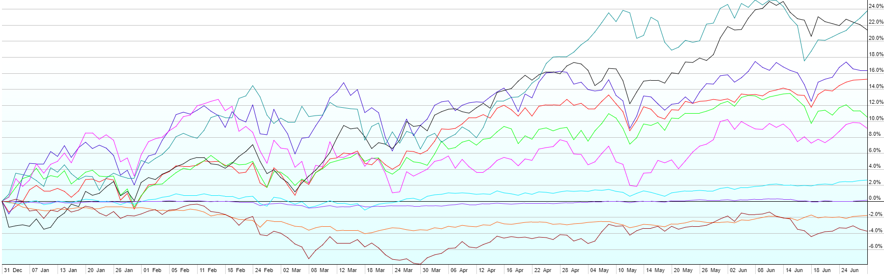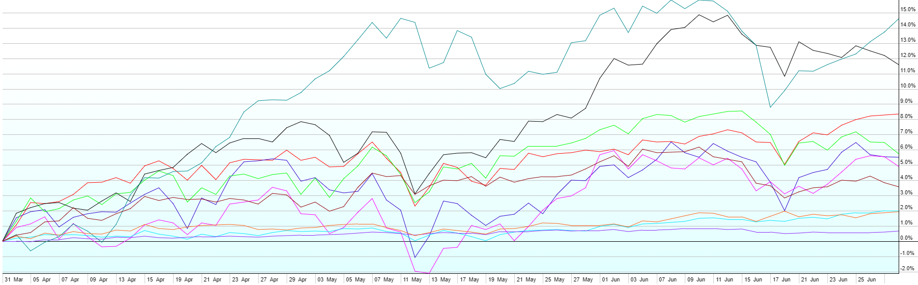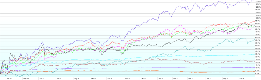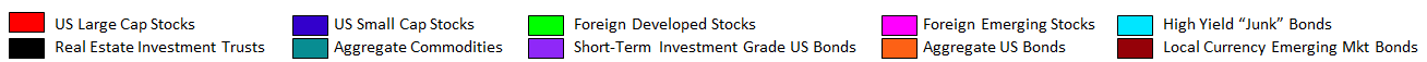 - Another solid quarter in Q2 for all assets classes. Commodities led the way (+15%) as the world got a strong whip of inflation. Whether that’s transitory as the Fed expects or not, remains to be seen. Real Estate Investment Trusts (REITs) (+12%) were close behind. US Large Cap (+8%), Foreign Developed (+6%), US Small Caps (+5%) and Emerging Markets (+5%) also had great quarters. Emerging Market Bonds (+4%) were the winners in fixed income, with High Yield (+2%), US Aggregate Bonds (+2%), and Short-Term Corporate Bonds (+1%) close behind. Treasury Inflation Protected Bonds (not shown on the charts) were +3% in the quarter, again on the back of higher consumer prices.