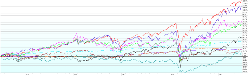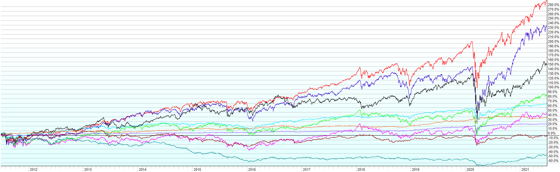 - While commodities have roared back over the last year, the 5 and 10-year charts show just how far they’ve lagged behind other asset classes. Commodities generally track inflation over the long-term, and they really suffered after the financial crisis, the oil glut, and the early part of covid.
