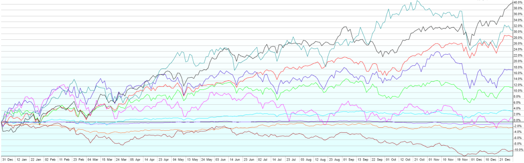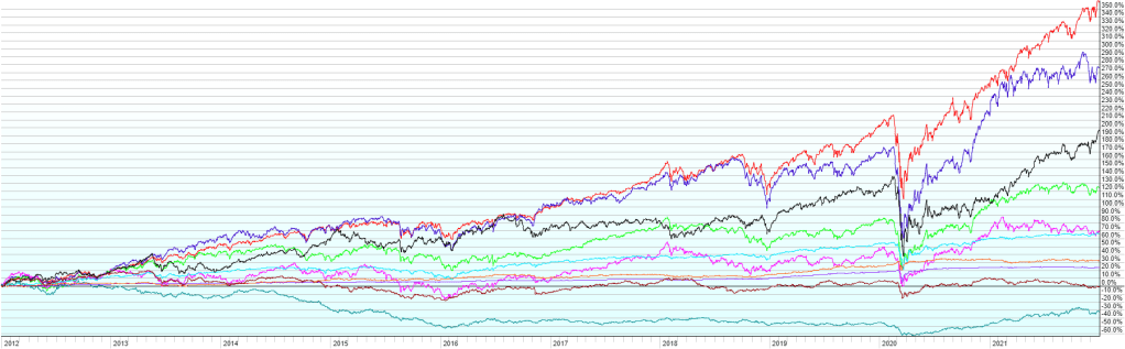 This post contains the usual returns by asset class for this past quarter (by representative ETF), last year, last five years, last ten years, and since the covid low (3/23/2020). While there is still no predictive power in this data, I’ll continue to post this quarterly for those of you that are interested.