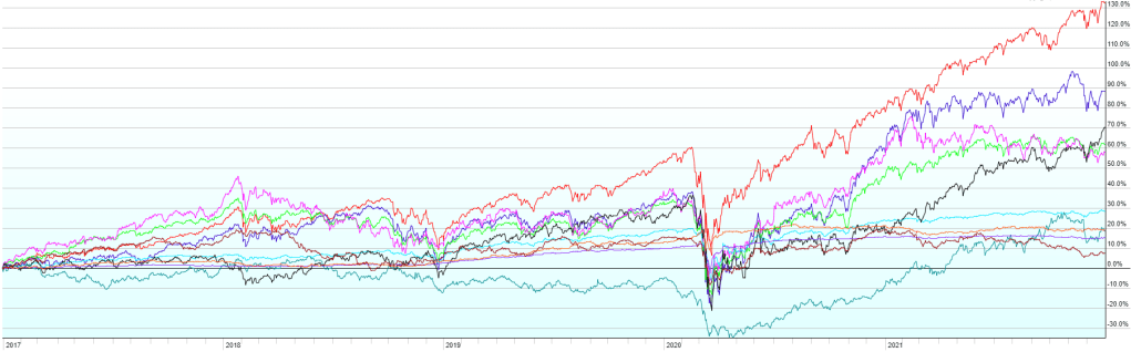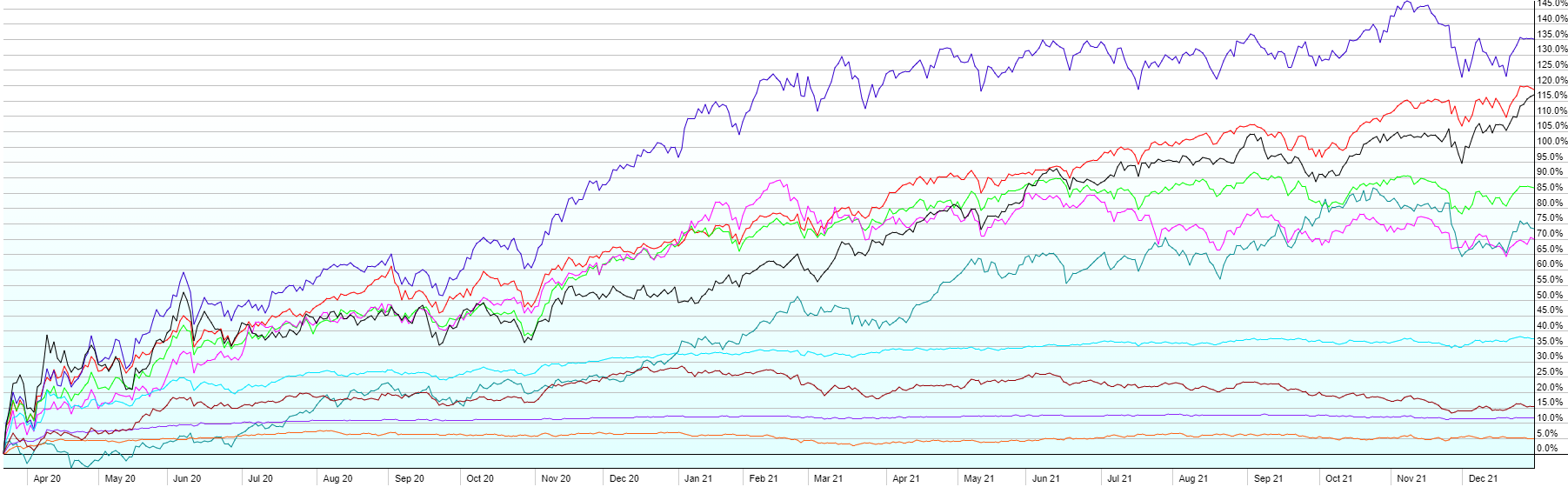 - For 2021 as a whole, the only truly poor performing asset class was Emerging Market Bonds (-10%) as the U.S. Dollar rallied and fears of a liquidity crunch in emerging markets dominated as the Fed begins to pull back on stimulus and even start raising rates in 2022. US significantly outperformed Foreign stocks as well. Real Estate (+41%) and Commodities (+29%) won the year as interest rates remained low as inflation spiked.