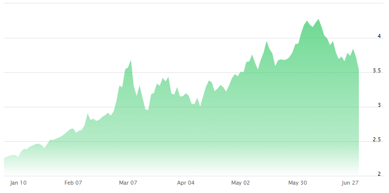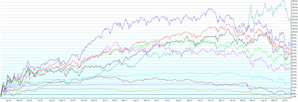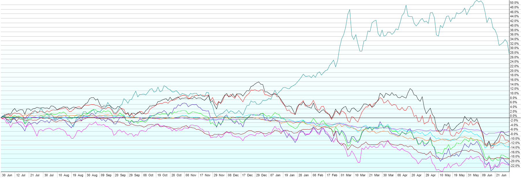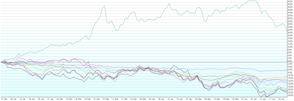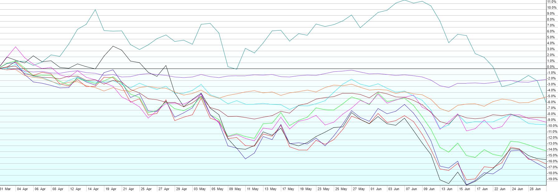 - Even commodities turned in negative performance for Q2. After being up as much as 11% for the quarter in early June, a sharp downturn across the board, and especially in energy delivered a -6% quarter.