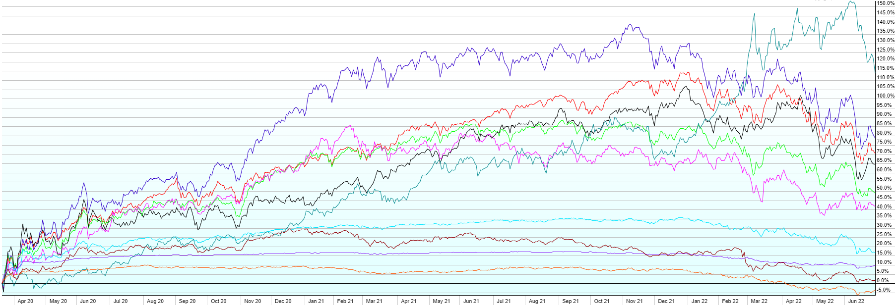 - The worst performing areas of the market in Q2 were the same as in Q1. The ARK Innovation ETF (ARKK), down almost 30% in Q1, tumbled another 40% in Q2, and is now down almost 75% from its 2021 peak. On the flip side, US value stocks are still holding up relatively well, down only 9% YTD vs. the S&P 500’s -20%.