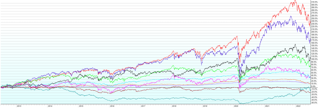 This post contains the usual returns by asset class for this past quarter (by representative ETF), year-to-date, last 12 months, last five years, last ten years, and since the covid low (3/23/2020). While there is still no predictive power in this data, I’ll continue to post this quarterly for those of you that are interested.