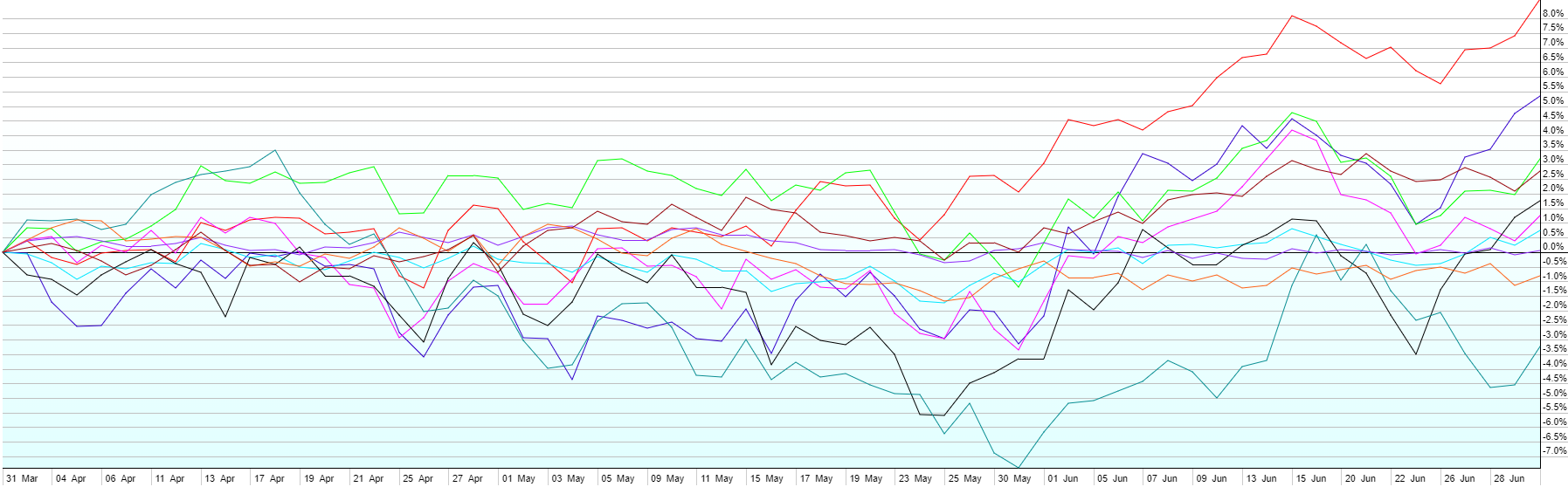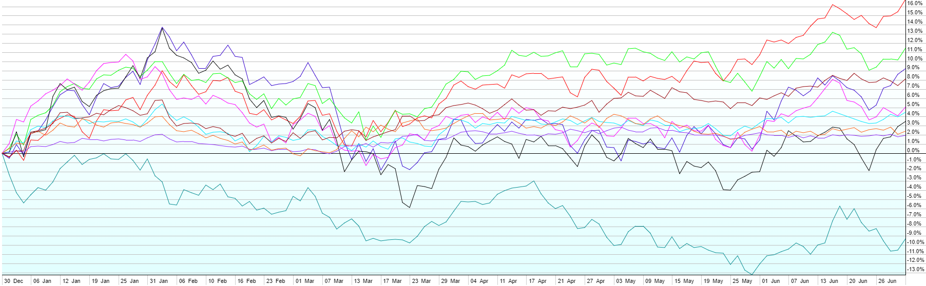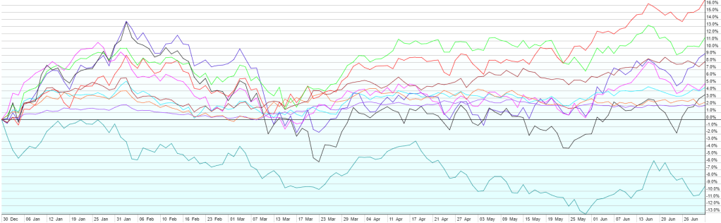 - With jobless claims rising for most of the quarter, softness in many economic indicators, core inflation still running stubbornly hot, and the Fed once again increasing its expectation for further rate hikes (despite a pause at their last meeting), one would think Q2 would have been a messy quarter for stocks. However, just the opposite happened, once again, causing pain for those that think they can time the stock market.
