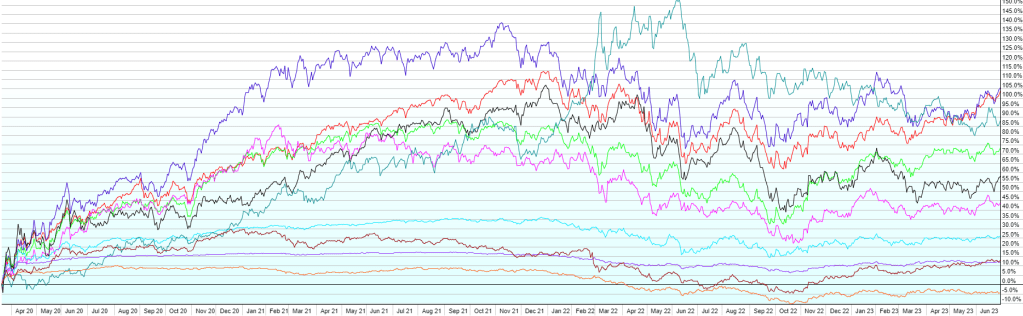 - Not shown in the charts above, but growth outperformed value again in Q2. Speculative areas of the market have been heating up in 2023 after getting clobbered in 2022.