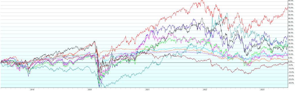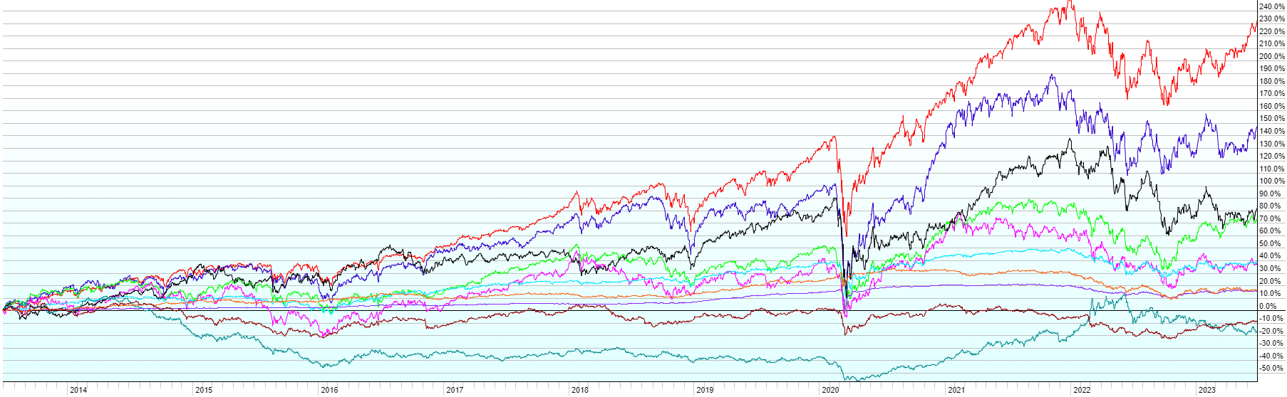 This post contains the usual returns by asset class for this past quarter (by representative ETF), year-to-date, last 12 months, last five years, last ten years, and since the covid low (3/23/2020). While there is still no predictive power in this data, I’ll continue to post this quarterly for those of you that are interested.