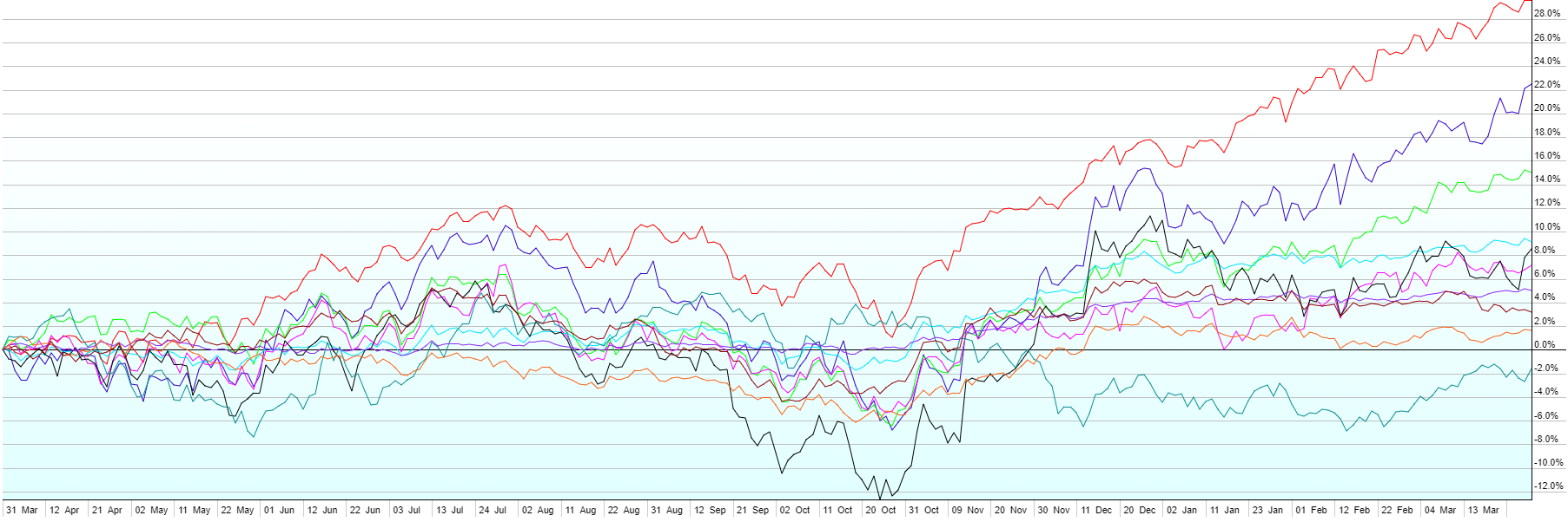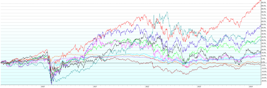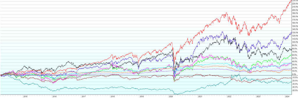 This post contains the usual returns by asset class for this past quarter (by representative ETF), last 12 months, last five years, last ten years, and since the covid low (3/23/2020).  While there is still no predictive power in this data, I’ll continue to post this quarterly for those of you that are interested.