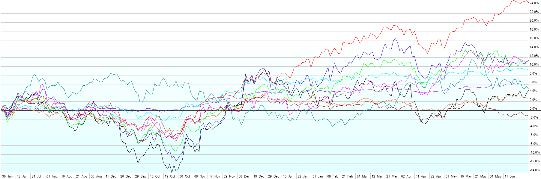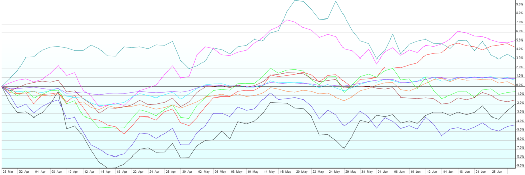 Mixed results across asset classes for Q2 kept most diversified portfolios relatively steady in Q2 2024. Emerging market stocks and US Large Cap (led especially by mega caps in tech/AI) outperformed with 5.2% and 4.4% returns respectively. On the flip side, US Small Caps were down 4.2% for the quarter with only ~38% of the stocks in the Russell 2000 closing higher than they started the quarter. In between the best and the worst were Commodities (+3.1%), US Short-term Corporate Bonds (+0.9%), US High Yield (+0.7%), US Aggregate Bonds (+0.1%), Foreign Developed Stocks (-0.6%), Emerging Market Bonds (-1.6%), and US Real Estate Investment Trusts (-1.9%).