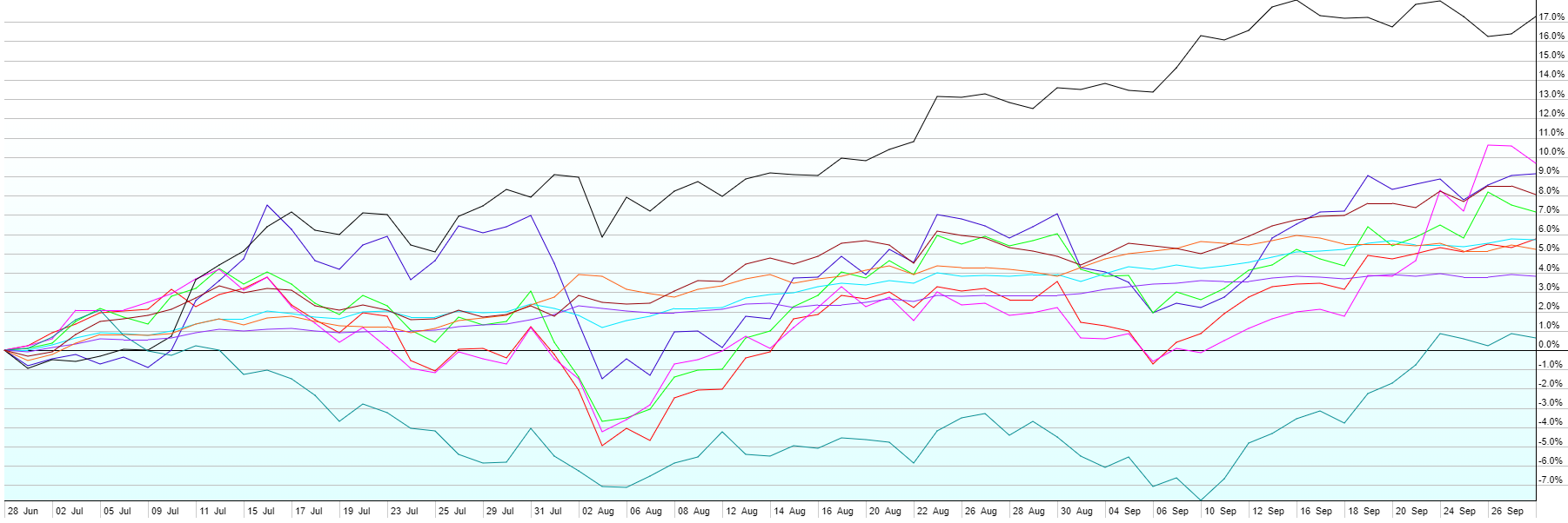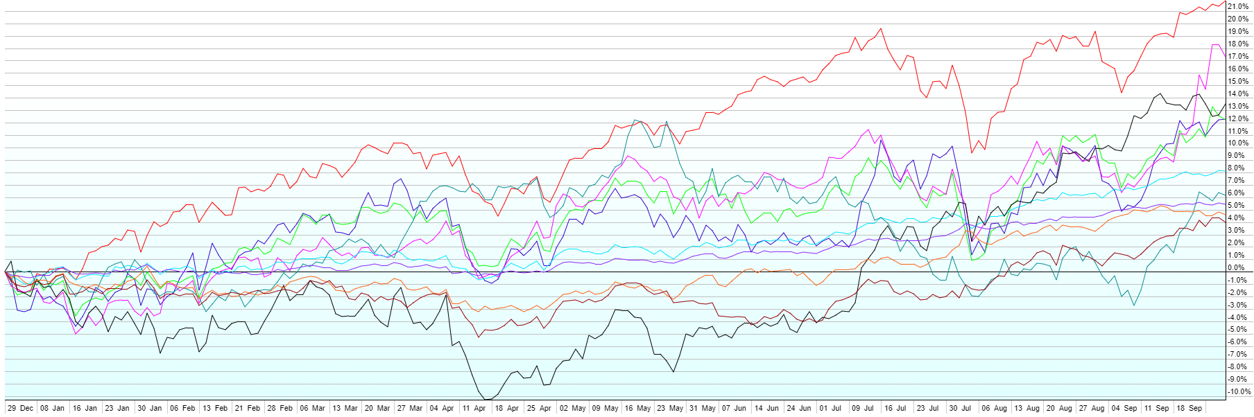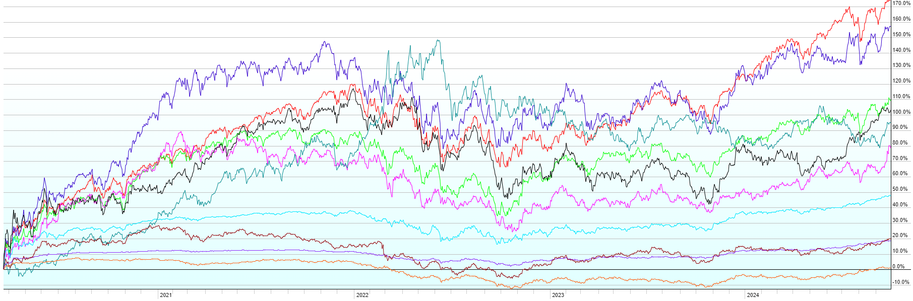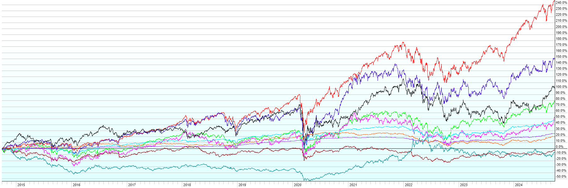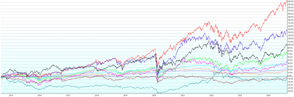 Q3 2024 was a fantastic quarter for financial markets as the US economy chugged along, inflation continued to ease around the world, China launched new stimulus measures to strengthen it’s economy, and the Federal Reserved began a rate cutting cycle with a 50 basis point reduction in the Fed Funds rate. Rather than waiting for severe economic weakness to cut rates, as they have typically done in the past, the Fed decided to cut aggressively and begin to ease up on the brakes they’ve been applying to the economy as a way of fighting inflation. All asset classes that we follow in this quarterly message posted gains, led by Real Estate Investment Trusts (+17%). In the middle of the pack, but still with strong returns, were Emerging Market Stocks (+9.7%), US Small Caps (+9.1%), Emerging Market Bonds (+8.1%), Foreign Developed Stocks (+7.1%), US Large Cap Stocks (+5.8%), US High-Yield Bonds (+5.7%), US Aggregate Bonds (+5.2%), and Short-Term Corporate Bonds (+3.8%). Bringing up the rear were Commodities, still positive at 0.6% despite a pull-back in the energy sector.