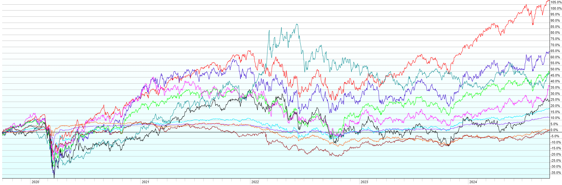 This post contains the usual returns by asset class for this past quarter (by representative ETF), year-to-date, last 12 months, last five years, last ten years, and since the covid low (3/23/2020).  While there is still no predictive power in this data, I’ll continue to post this quarterly for those of you that are interested.