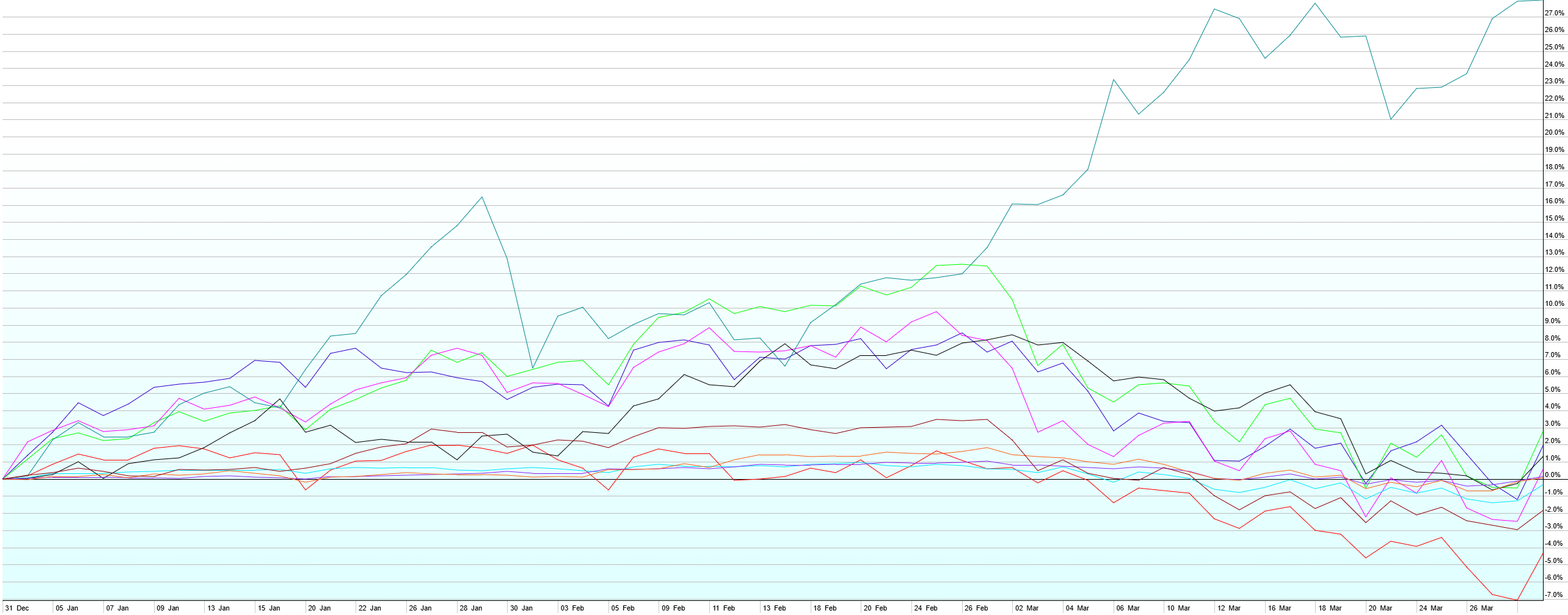 Higher energy prices resulting from the “military action” in Iran ground the stock rally to a halt in Q1. While there hasn’t been too much damage overall, at least not yet, stocks around the world are off their highs on the order 5-15%. Diversification paid off once again in Q1 with Commodities leading the way, up 28%. International Developed Stocks finished Q1 up 2.8%, mostly due to their stellar performance in Jan and Feb (they were up 12% at one point). US Small Caps (+1.9%) fared significantly better than Large Caps (-4.4%), which were the worst performer of the quarter. In the middle of the pack were US REITs (+1.4%), Emerging Market Stocks (+0.5%), US Aggregate Bonds (+0.1%), US Short-Term Corporate Bonds (+0.1%), US High-Yield Bonds (-0.4%), and Emerging Market Bonds (-1.9%). The market pulled back the odds more Fed cuts in 2026 substantially, going from 1-3 more cuts expected this year at the start of Q1 to 0-1 more cuts at the end of Q1. This is the result of higher energy prices, which could put pressure on broader inflation and cause the Fed to be more restrictive with policy. Much of the damage already done in the Middle East will have a lasting effect on energy prices, even if tensions ease immediately. It remains to be seen whether those higher energy prices restrict the global economy enough to decrease demand (recession) or if the economy continues to chug along with higher prices and even higher expectations of higher prices passing through to goods and services (inflation). The Fed, along with it’s incoming new chairman, is in a tough spot trying to price rates for a very uncertain future.