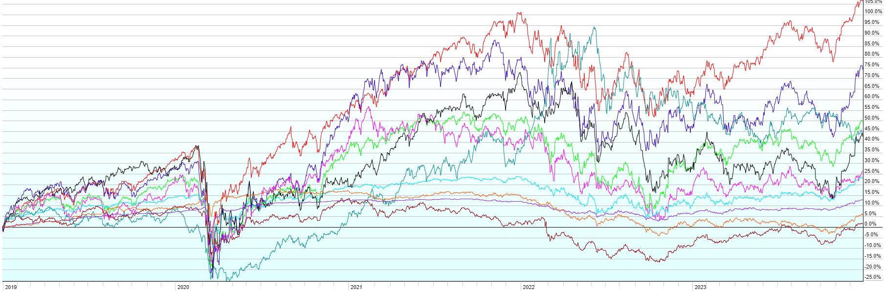 This post contains the usual returns by asset class for this past quarter (by representative ETF), full year 2023, last five years, last ten years, and since the covid low (3/23/2020).  While there is still no predictive power in this data, I’ll continue to post this quarterly for those of you that are interested.