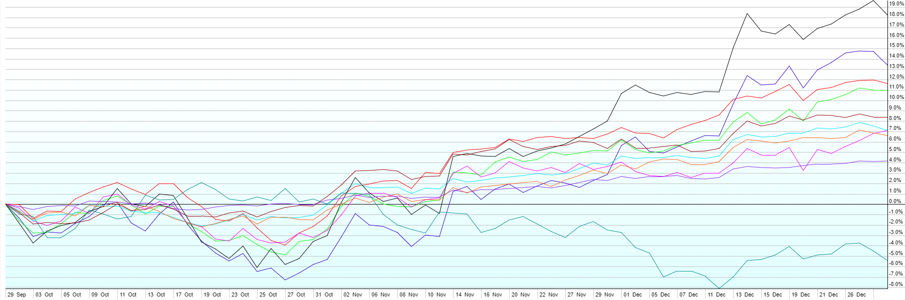 The rollercoaster continued in Q4, with fantastic returns across the board (excl. commodities, but that’s probably a good thing and it’s another indicator of disinflation), after an up Q2 and a down Q3. Long-term interest rates pulled back as the Federal Reserve appears to have started their pivot toward rate cutting sometime in 2024. They left the door open for further hikes if inflation roars back, but after consecutive soft monthly inflation reports, the Fed is now forecasting three rate cuts (to 4.5-4.75% Fed Funds) by end of 2024. The benign inflation reports and the pivoting Fed sent stocks and bonds off to the races. REITs ended the quarter up more than 18% as the top performer (though that just puts them into the middle of the pack for 2023 as a whole. US Small Caps were up 13.4% with the seemingly ever-raging Large Caps up 11.6%. Foreign Developed (+11%), Emerging Market Bonds (+8.4%), Emerging Market Stocks (+7.1%), and High-Yield Bonds (+7.1%) round out the aggressive side of portfolios. The conservative side also had great returns with US Aggregate Bonds up 6.6% and US Short-Term Corporate Bonds up 4.1%. Commodities (-5.4%), as mentioned above, were the only sore spot for the quarter, with energy prices dropping as the disinflation narrative took hold. It remains to be seen if the Fed can engineer a soft landing for the economy with inflation falling back toward their 2% goal, but without a spike in unemployment and a recession. High interest rates take their toll on economic growth and they work with the “long and variable lags”, about which, the Fed always reminds us. Stocks seem to believe the soft landing is a lock. Bonds seem to believe disinflation is a lock and the Fed is going to go into easing mode. If they’re both correct, 2024 will likely bring more gains with it. If not, it’s going to get interesting, especially for the more expensive areas of the market like US Large Cap stocks.